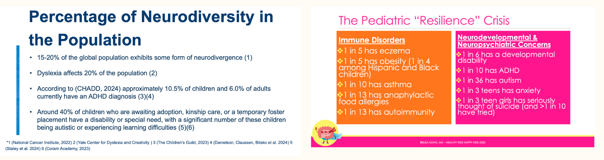 Two particularly impactful presentations were from children’s experts Dr. Elisa Song MD, one of the foremost pioneers and trusted experts in pediatric integrative and functional medicine, and Dr. Niki Elliott, PhD, a clinical professor of neurodiversity and embodied equity at the University of San Diego. They presented the unsettling numbers below that describe this “kid’s resiliency crisis,” as well as how we can contribute to a shifting narrative.